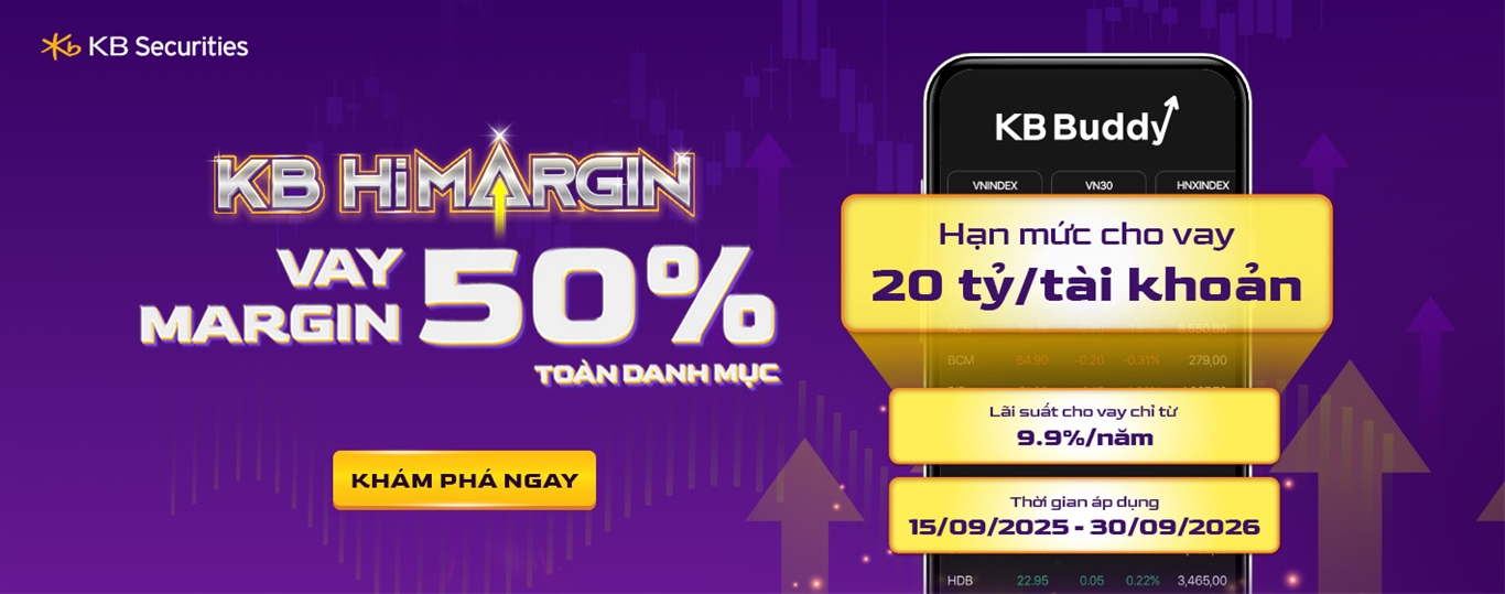 - Khách hàng đăng ký sử dụng sản phẩm KB HiMargin sẽ được áp dụng tỷ lệ cho vay 50% tất cả các mã chứng khoán trong danh mục cho vay ký quỹ tiêu chuẩn của KBSV được ban hành theo từng thời kỳ.